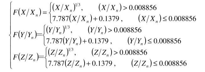 CIELab是CIE1976L*a*b*均勻顏色空間的簡稱,是由CIEXYZ色度系統經過非線性轉換得到的,它用明度指數L*,色品指數a*和b*構成的三維坐標系統來表示顏色感覺,其轉換公式如下: